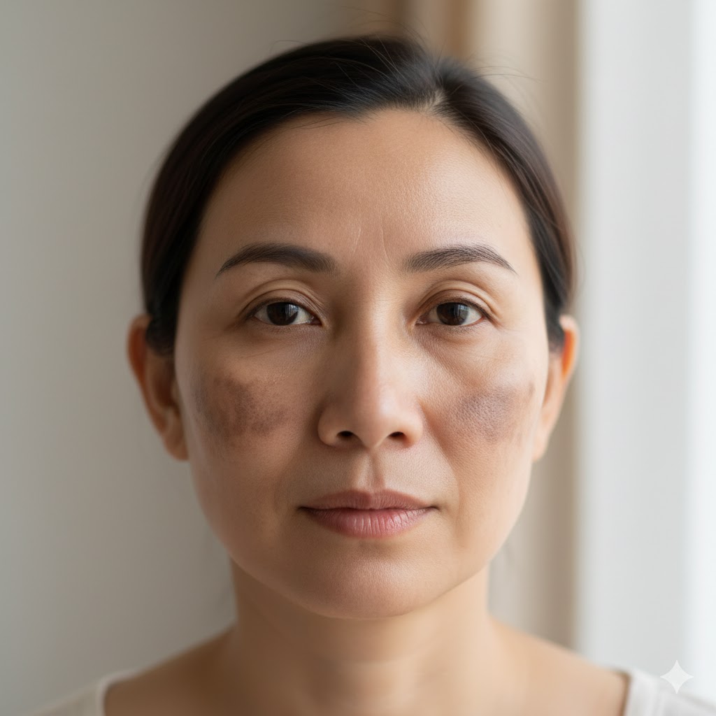 Khi estrogen giảm, làn da chúng mình không chỉ khô sạm mà còn dễ xuất hiện các biểu hiện như nám da do nội tiết và da nám sạm lan rộng. Hormone này đóng vai trò điều hòa sắc tố — cụ thể là kiểm soát hoạt động của melanocyte, tế bào sản sinh melanin. Khi mất cân bằng, melanin tăng sinh bất thường gây nám, tàn nhang nội tiết khó kiểm soát.