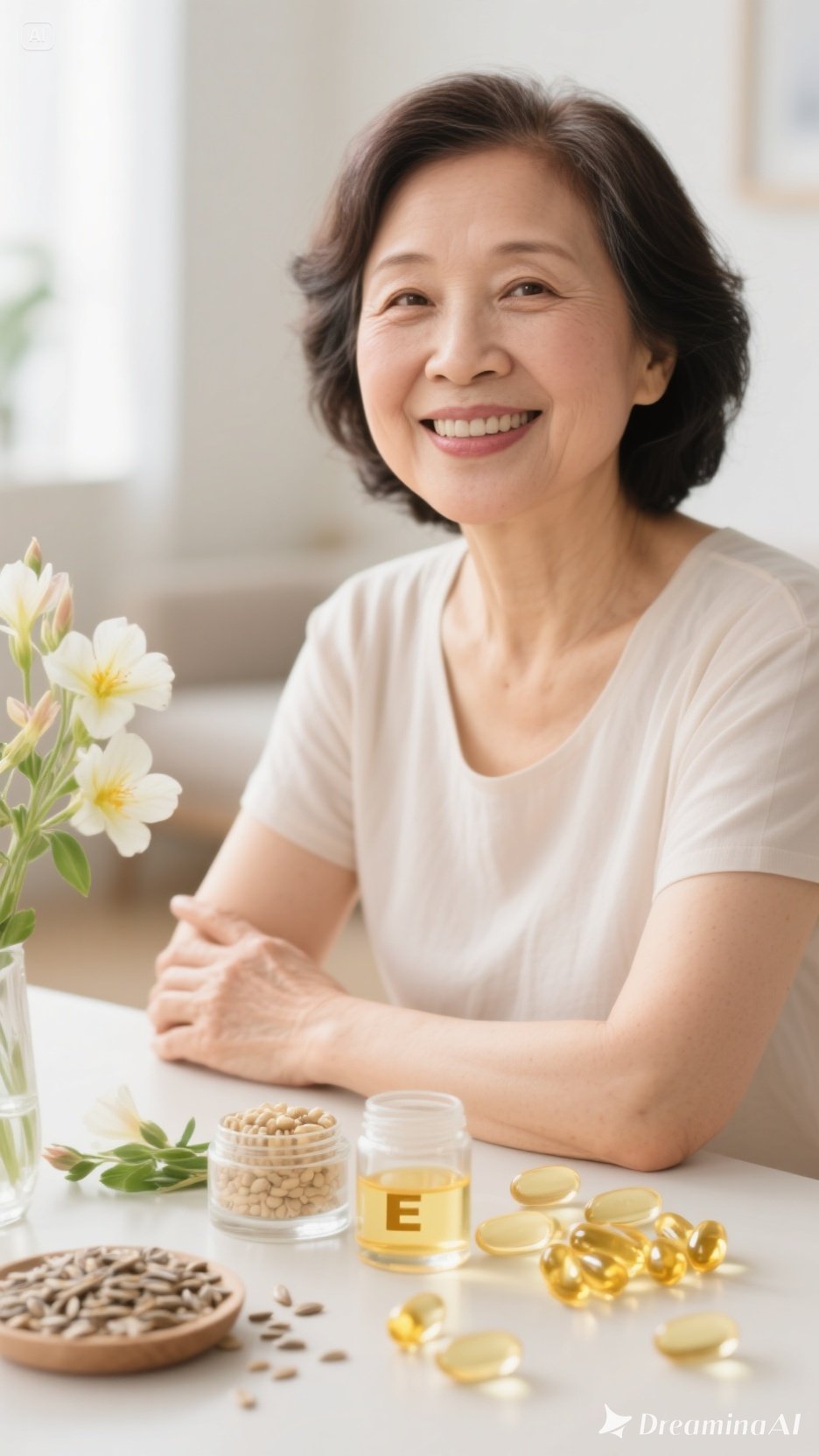 Vitamin E giảm khô hạn, hỗ trợ cân bằng nội tiết tố, cải thiện sinh lý nữ, tăng ham muốn và giúp phụ nữ mãn kinh tự tin hơn, an toàn tự nhiên.